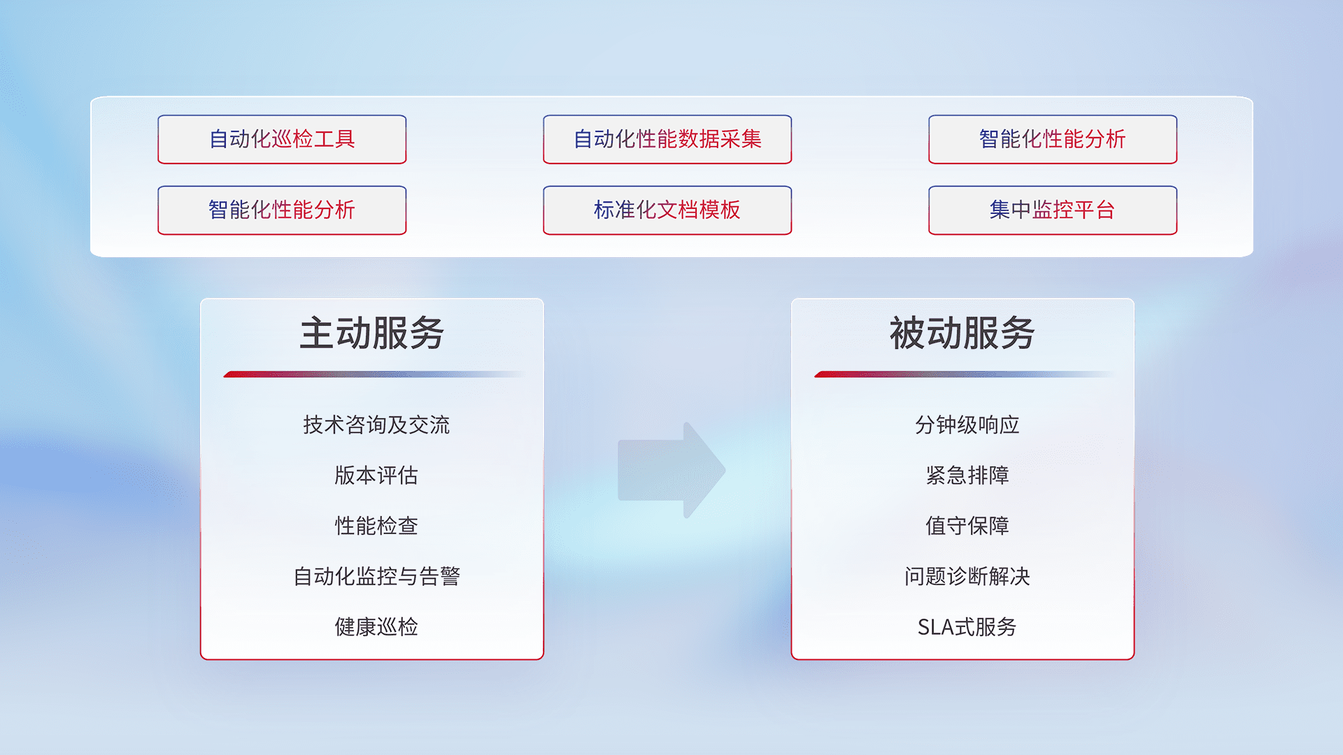 智能化工具和标准化文档,,,,保障服务质量,,提供主动服务(包含技术咨询、、、版本评估、、性能检查、、、自动化监控与告警、、、健康巡检)和被动服务包含(分钟级响应、、、、紧急排障、、值守保障、、、问题诊断解决、、SLA服务)。。。。