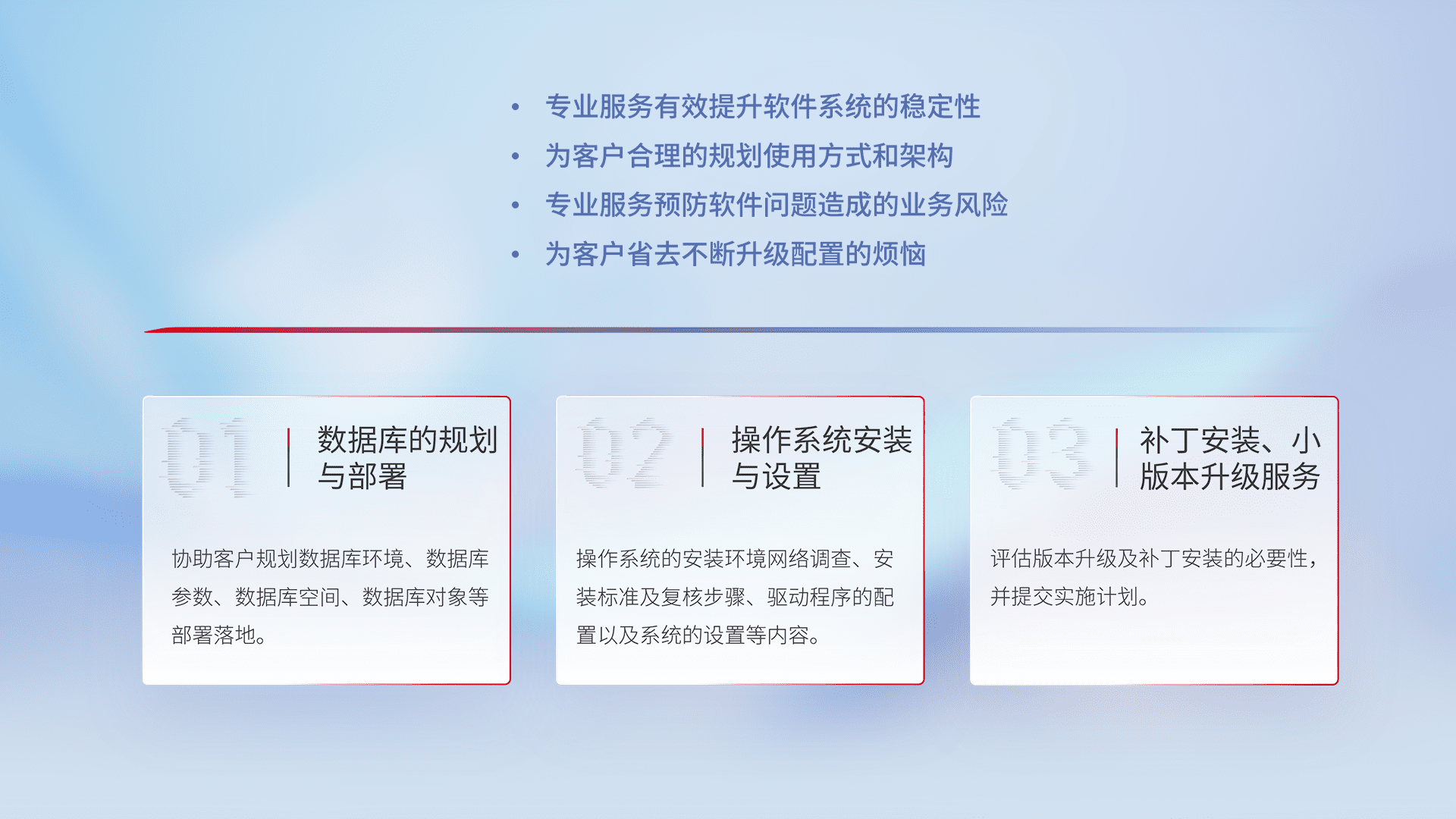 为客户提供软件规模升级、、、快速部署、、、按需配置的专业服务,,,从数据库的规划与部署到操作系统的安装与设置,,再到补丁安装和小版本升级提供支持。。。